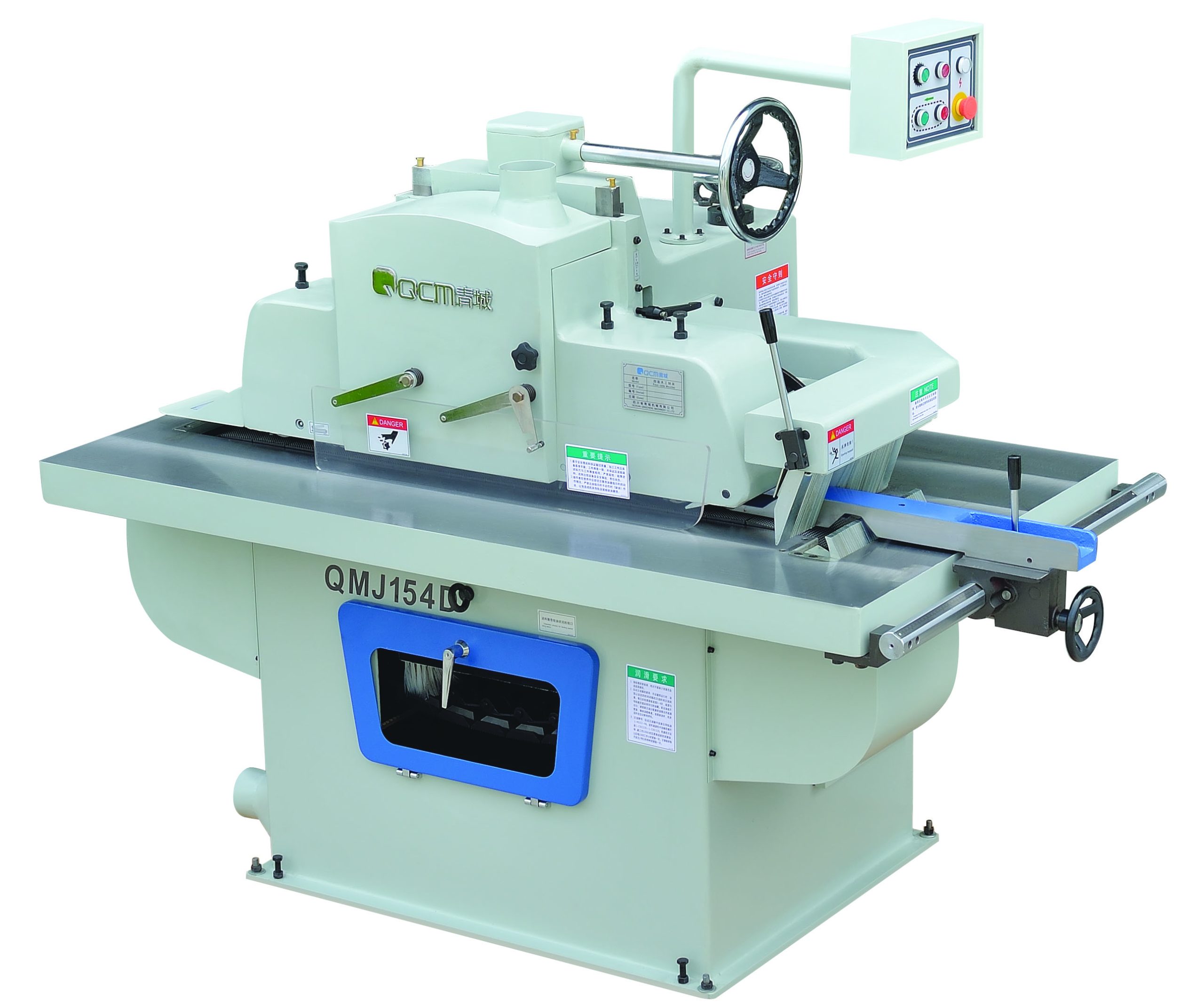 In order for operator safety, this machine is equipped with 4 sets of anti-kick back fingers, upper 3 and bottom 1. And it is with chain track feeding, the feeding speed change of it is by belt and pulley. Also we have other models: QMJ154F with frequency inverter for feeding speed change; QMJ154F-T with electric-lifting for pressure lifting. Please ask for the details.